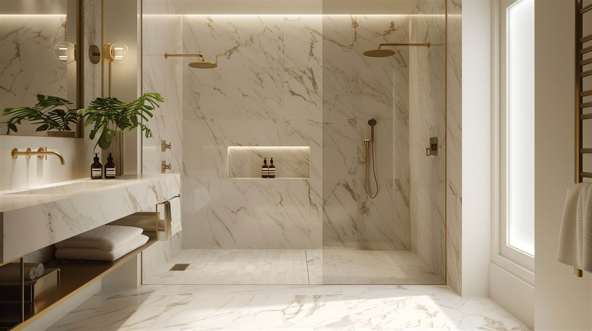 Soft tones, large-format tiling, and modern fixtures create hotel-style bathrooms designed for relaxation. Every detail reflects purpose, practicality, and elegant restraint.
