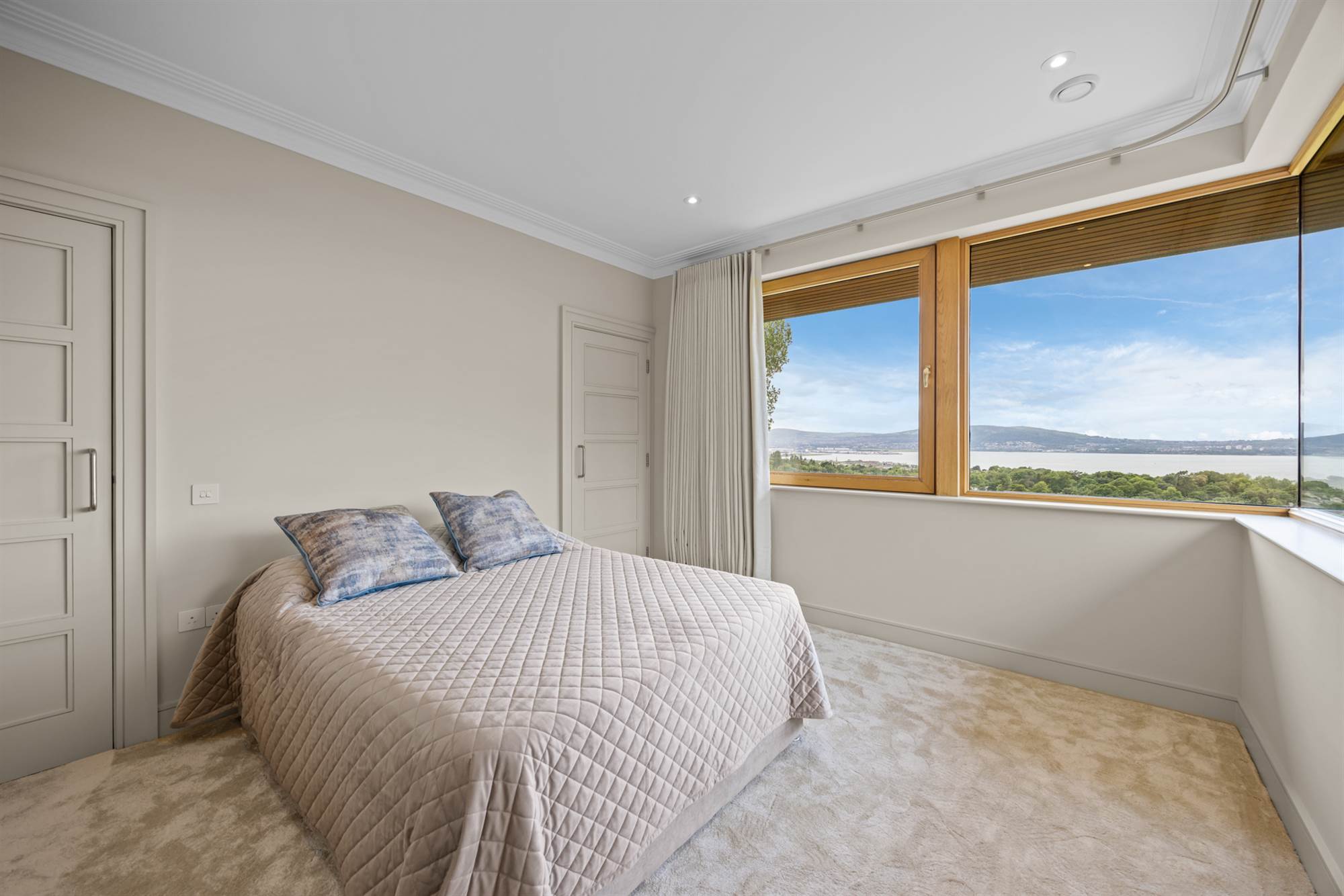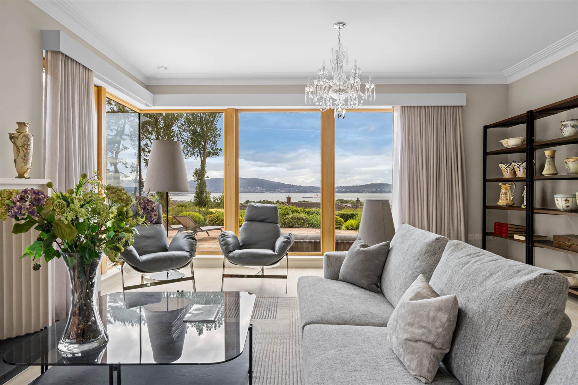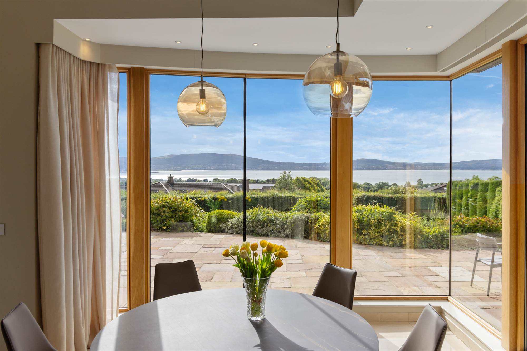 The property is a contemporary style two storey villa with a linear plan and garages extending to over c.5500 sq ft, designed around a stunning central entrance hall from ground floor to the roof, giving natural light and panoramic Lough views which create an instant and unforgettable impact.