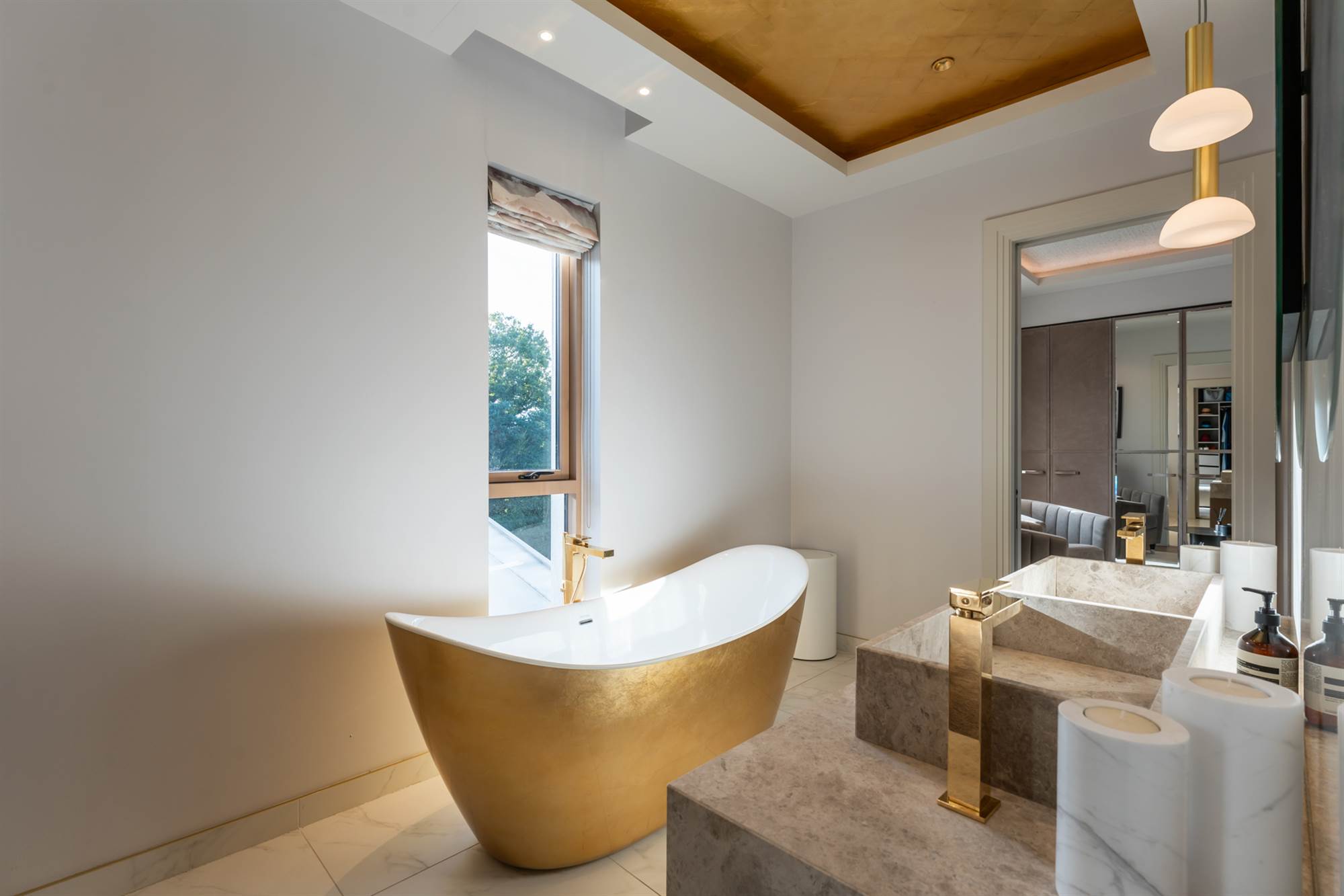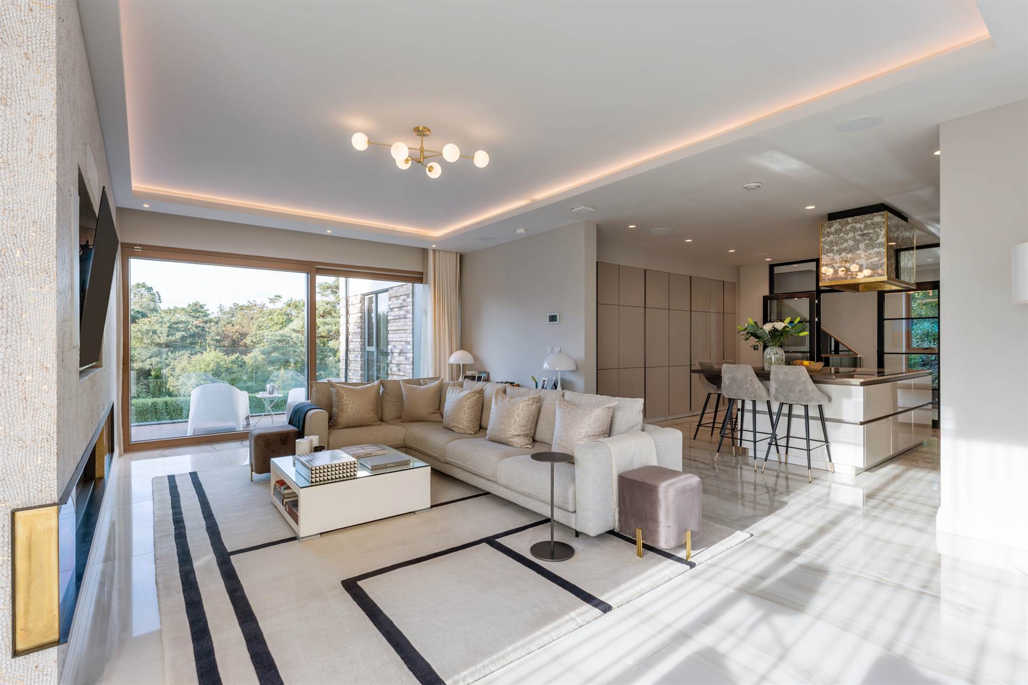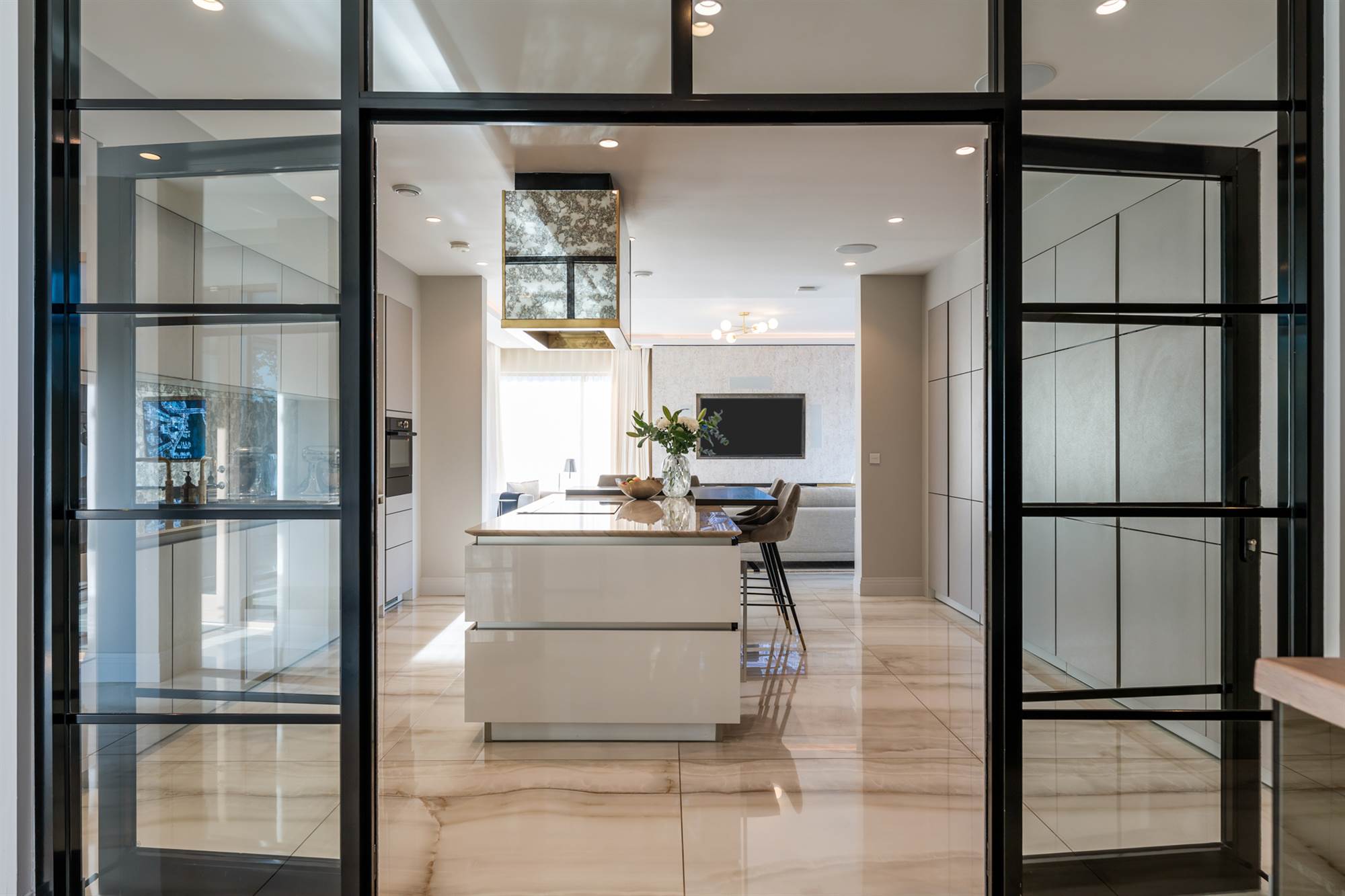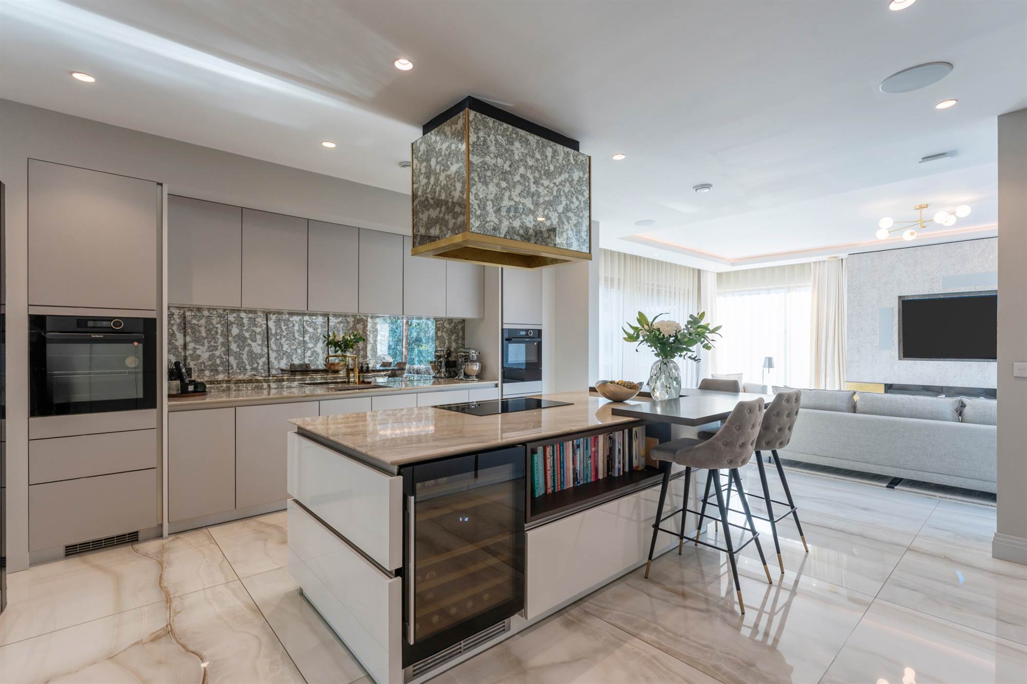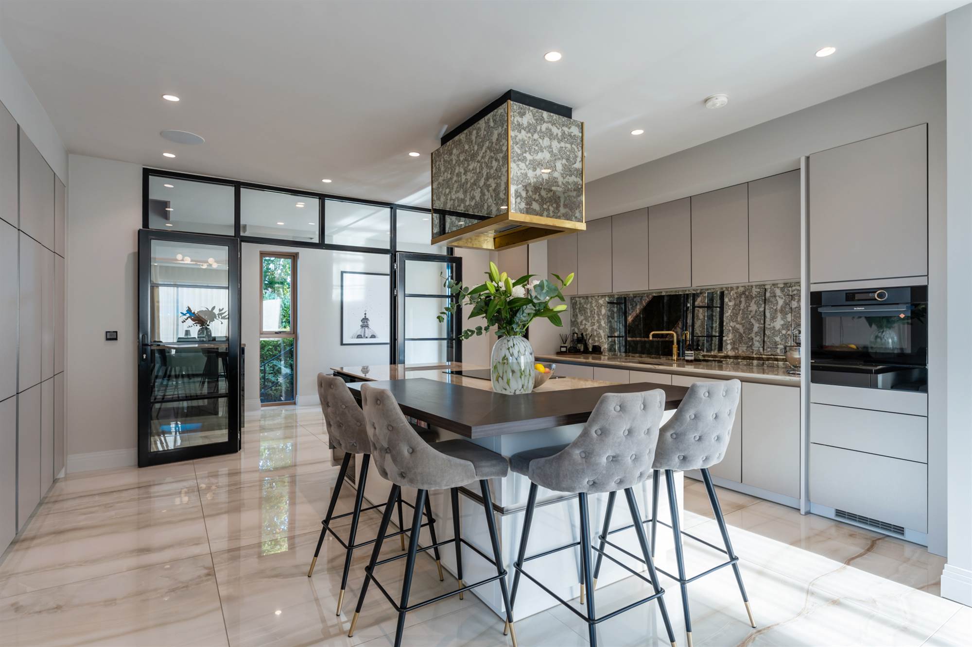 The front door leads to a bright entrance hall with marble tiling and a feature glazed crittall wall leading to the contemporary kitchen with solid marble worktops, a central island unit with antique style mirrored detailing. There is a concealed butler"s pantry which connects through to the formal dining room and home office.