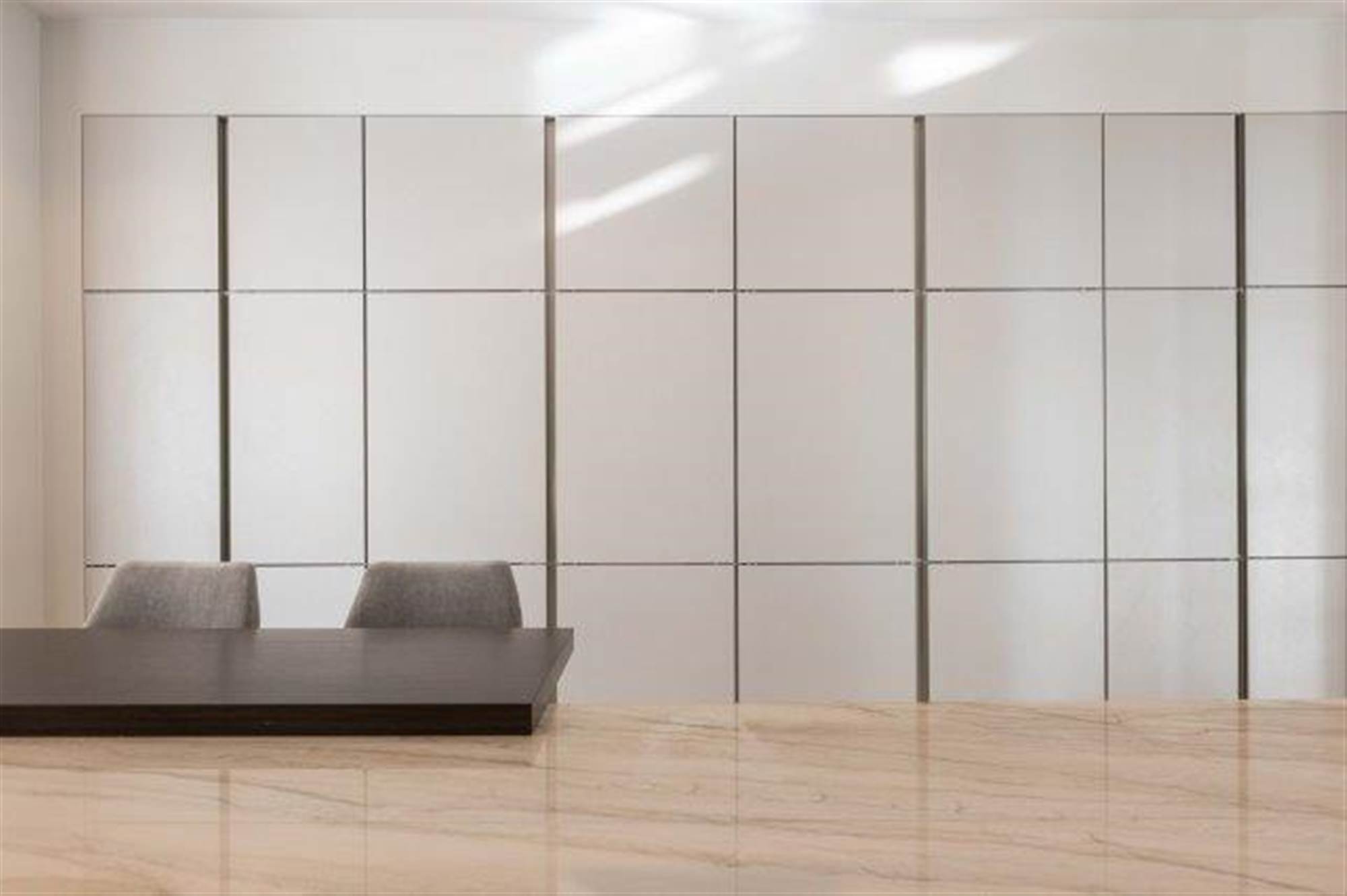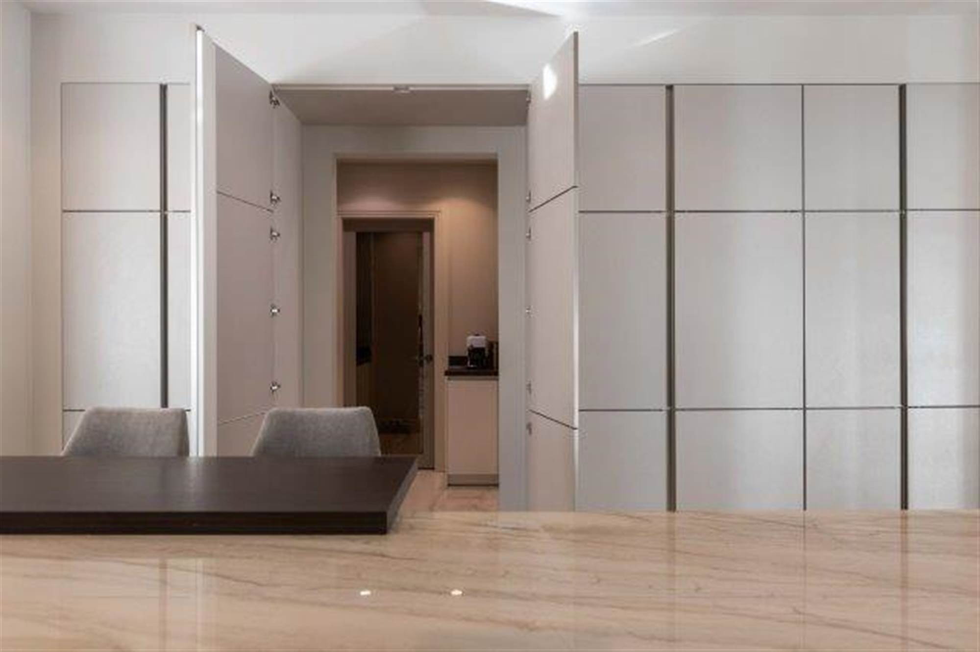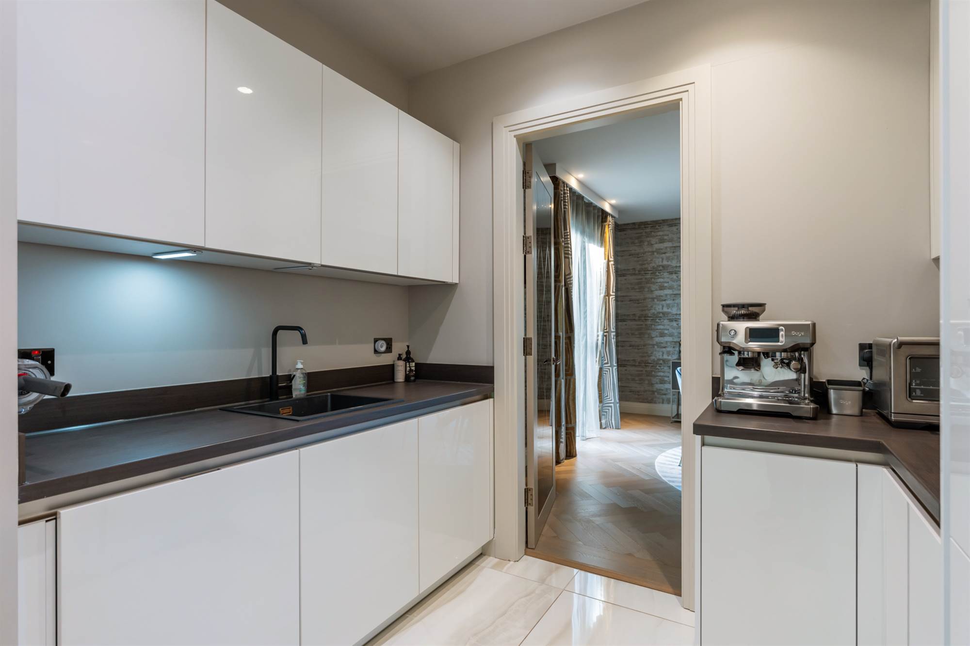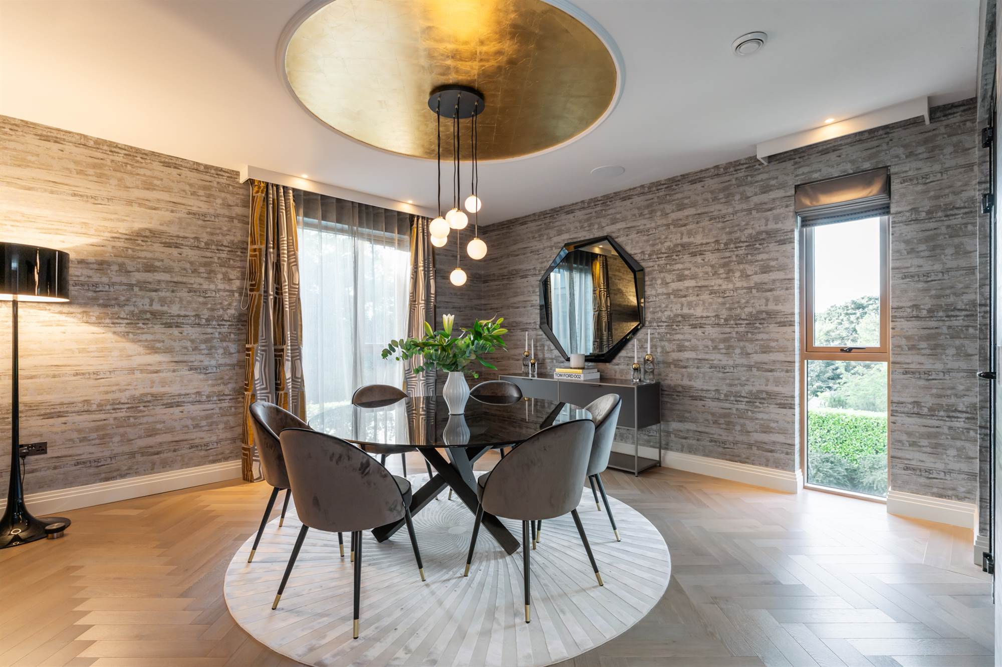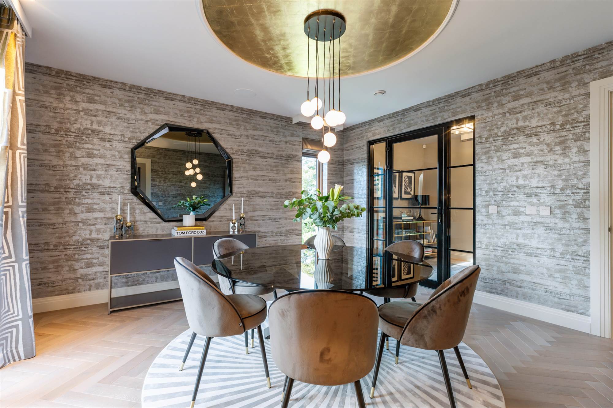 The formal dining room is a private entertaining space with a solid wooden herringbone floor with access to the entrance hallway and private access to the Butler"s pantry with glazed Crittall wall looking on to the home office.