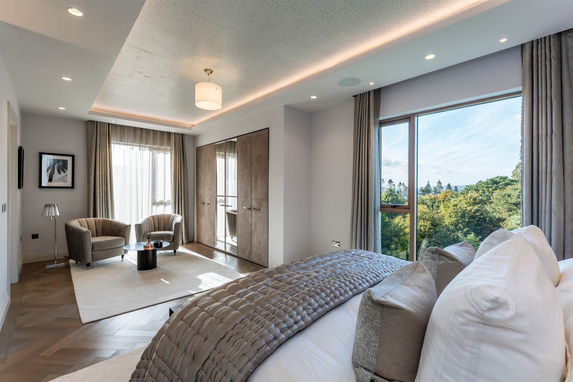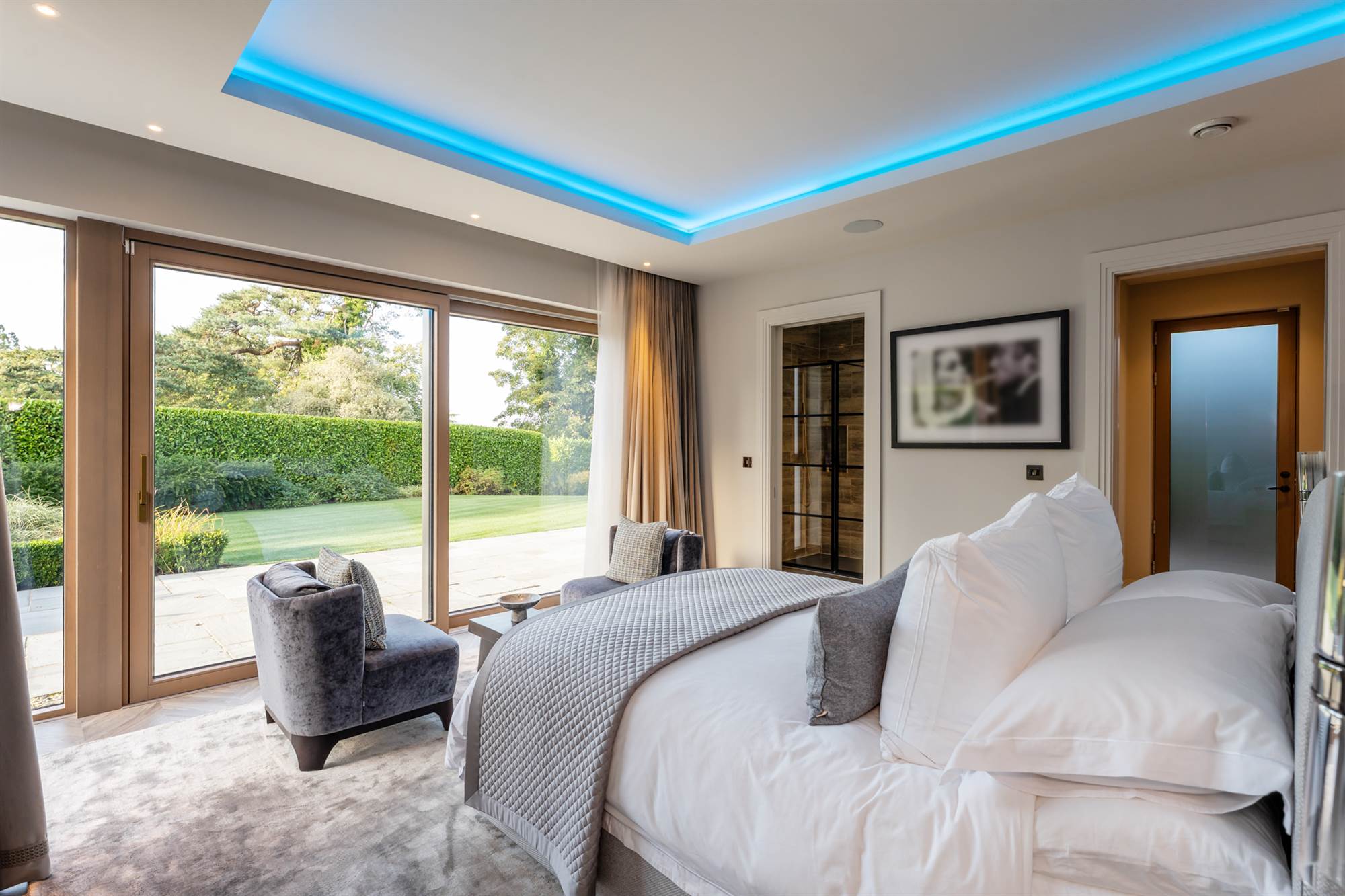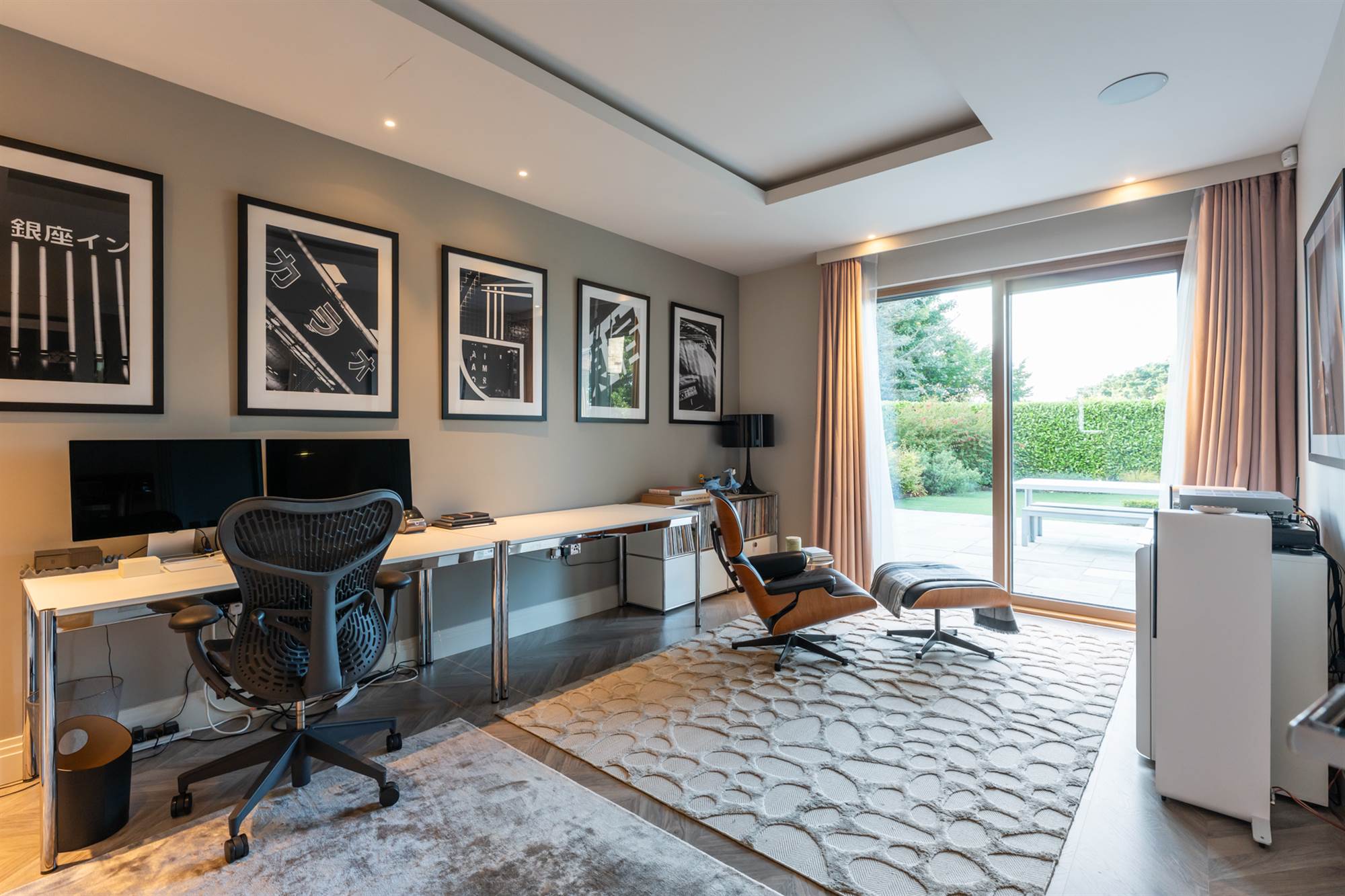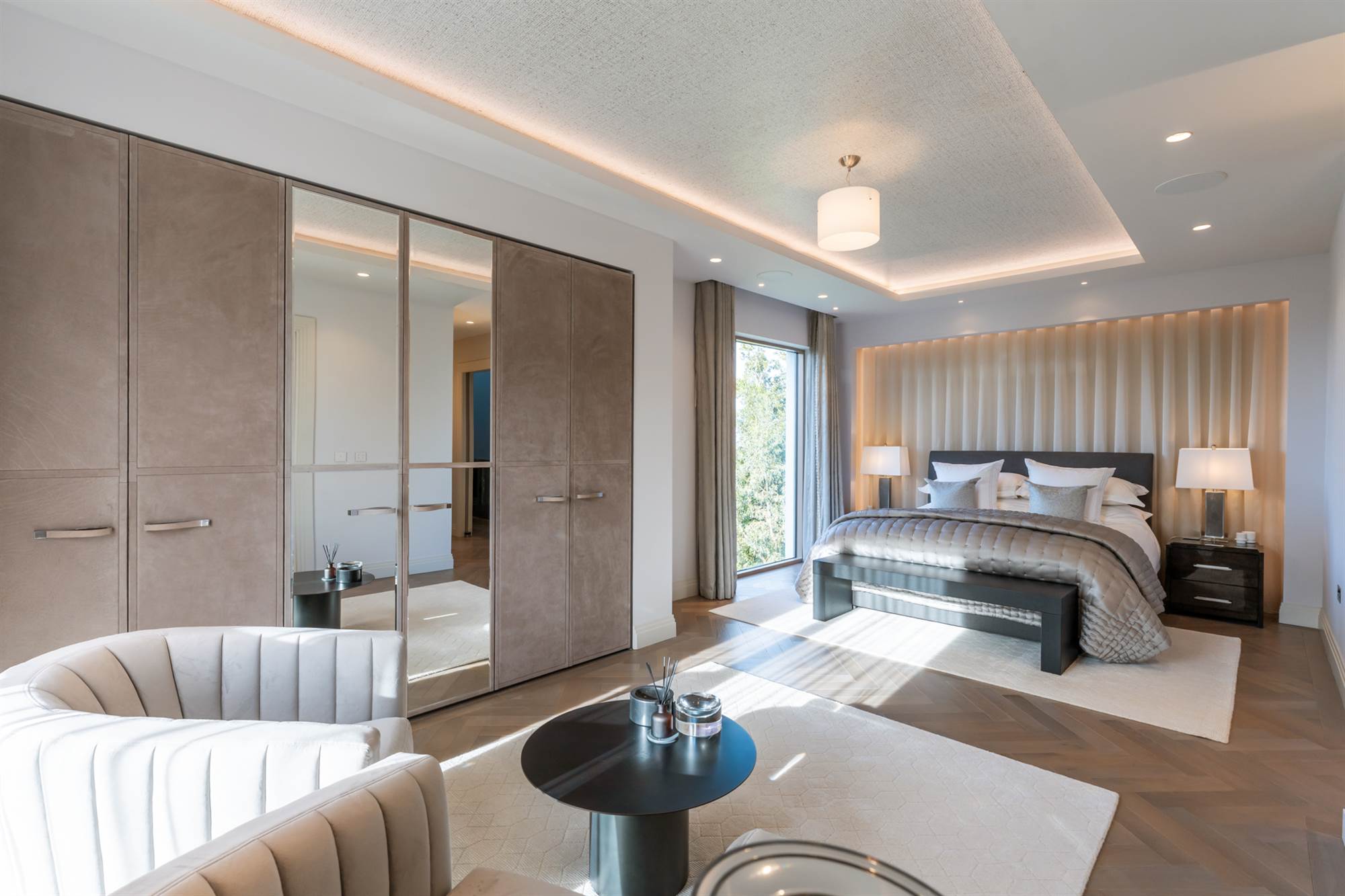 The lower ground floor has a pilates studio & gymnasium with crittall walls for natural light and wired for a speaker system. This lower floor also has 2 fantastic large bedroom suites with recessed ceilings, one with dressing area and vanity unit, both incorporating built in wardrobes and designer bathrooms. Finally there is a cinema room, wired for surround sound so all can enjoy movies, Netflix or sports at their leisure.