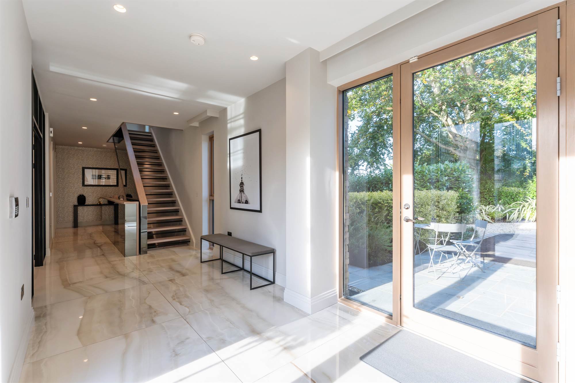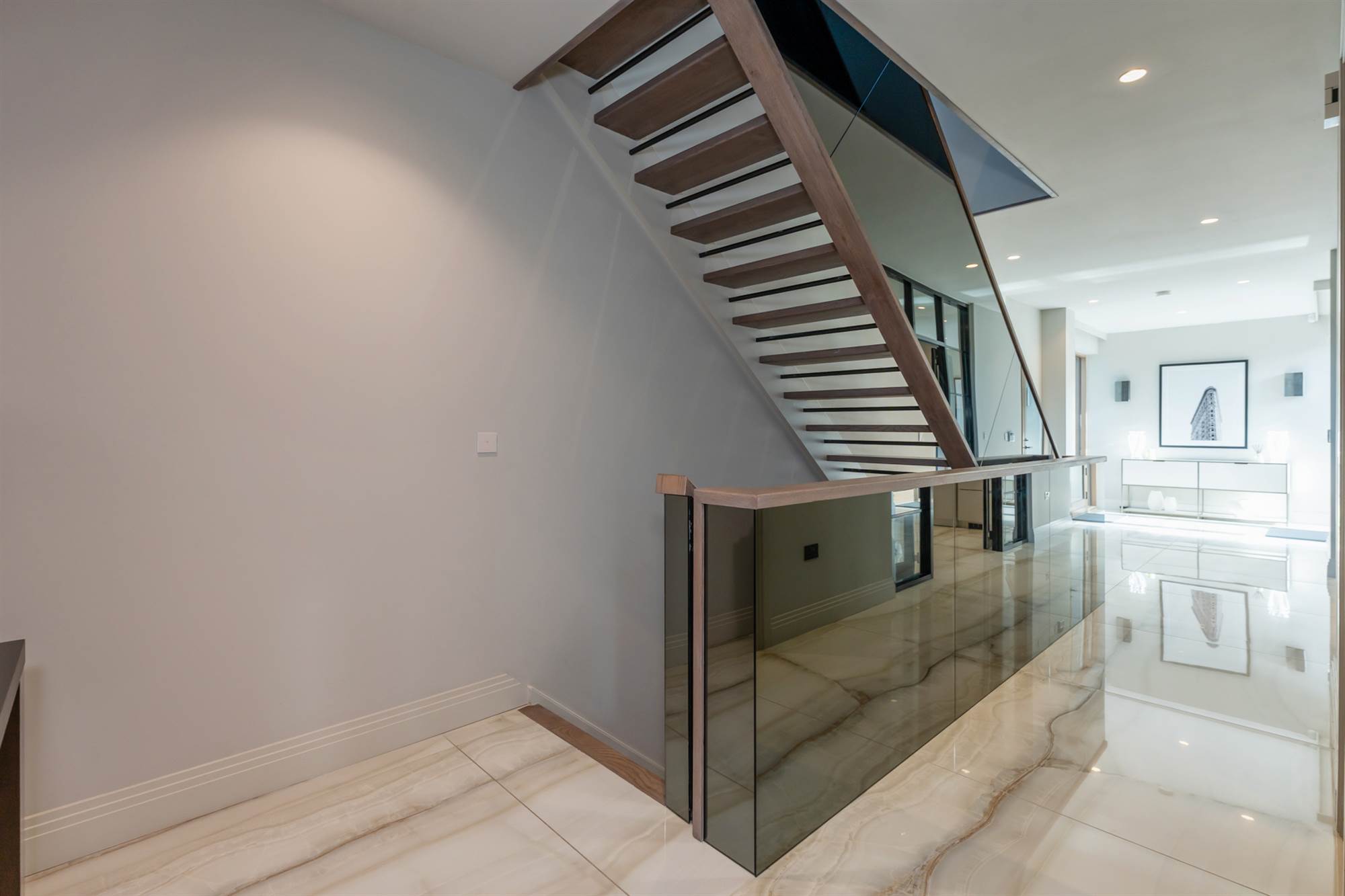 From the ground floor there is a bespoke stairwell with smoked mirror detailing and solid wooden treads which lead to the lower ground floor & garden level with the following accommodation: