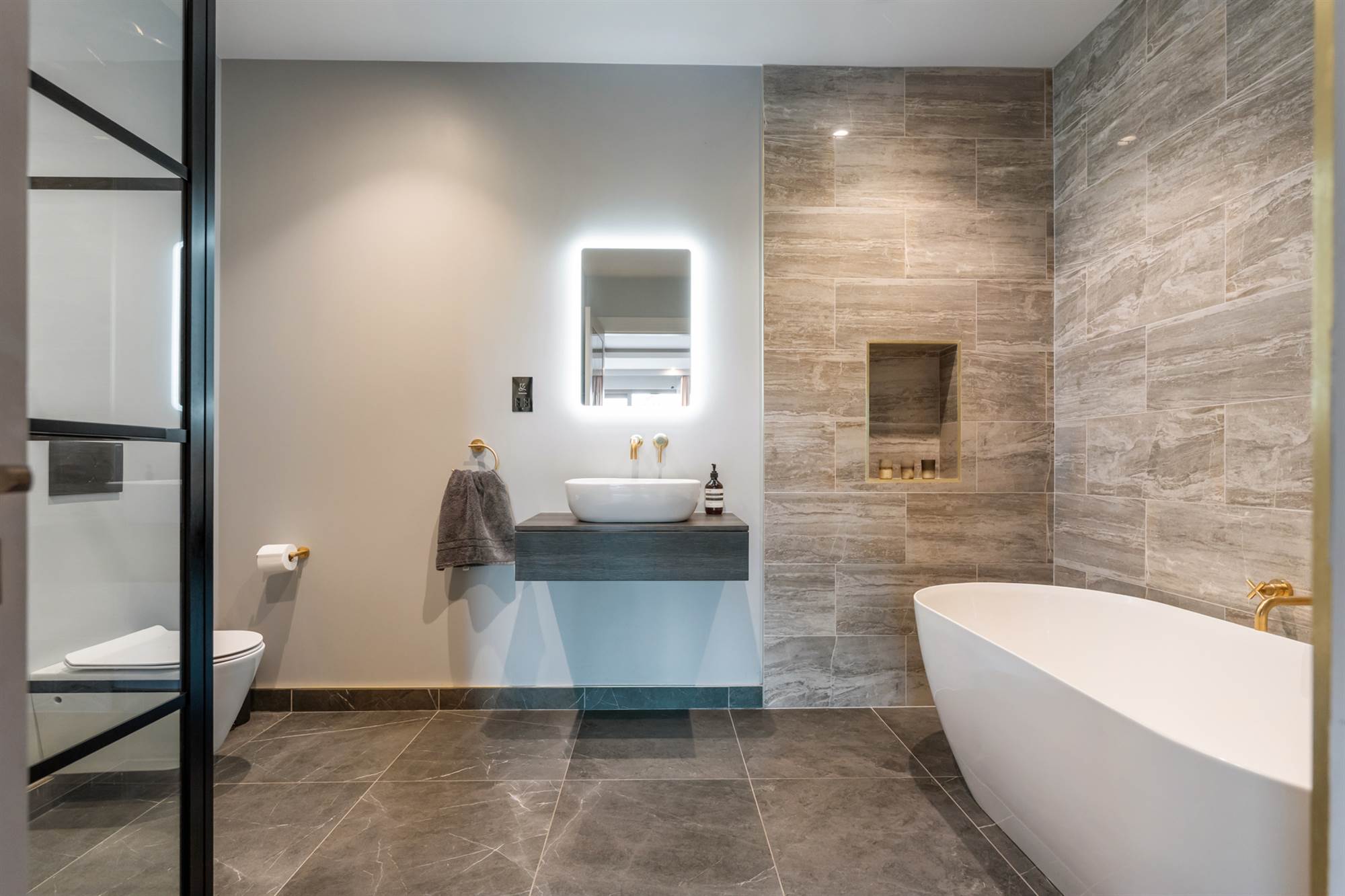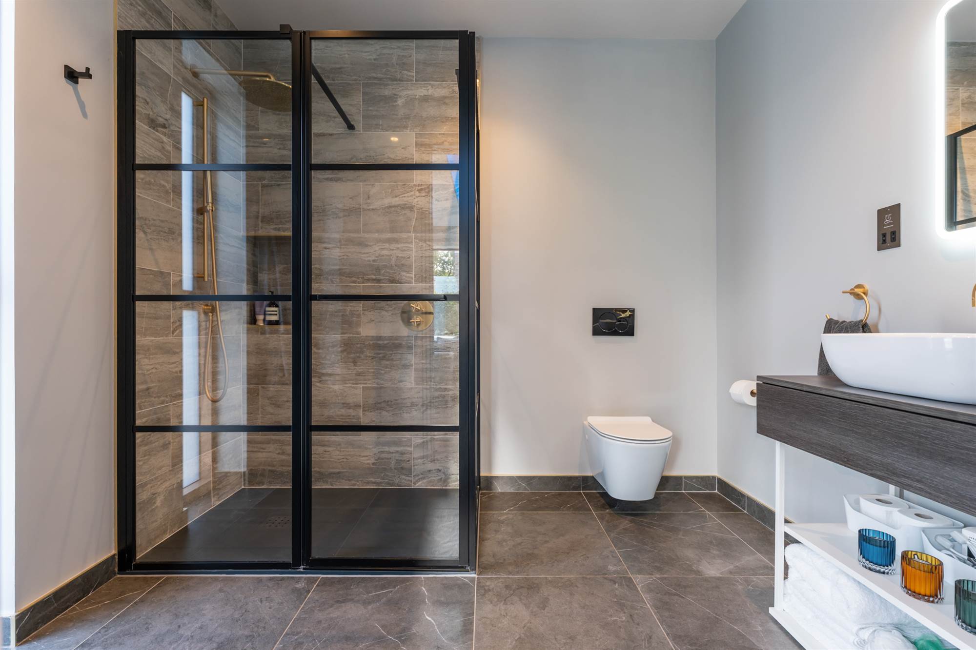 Also on the first floor is a double bedroom with ensuite shower room with stone and slate tiling and a Crittall wall glazed door.