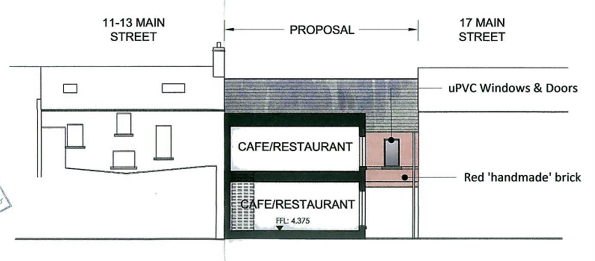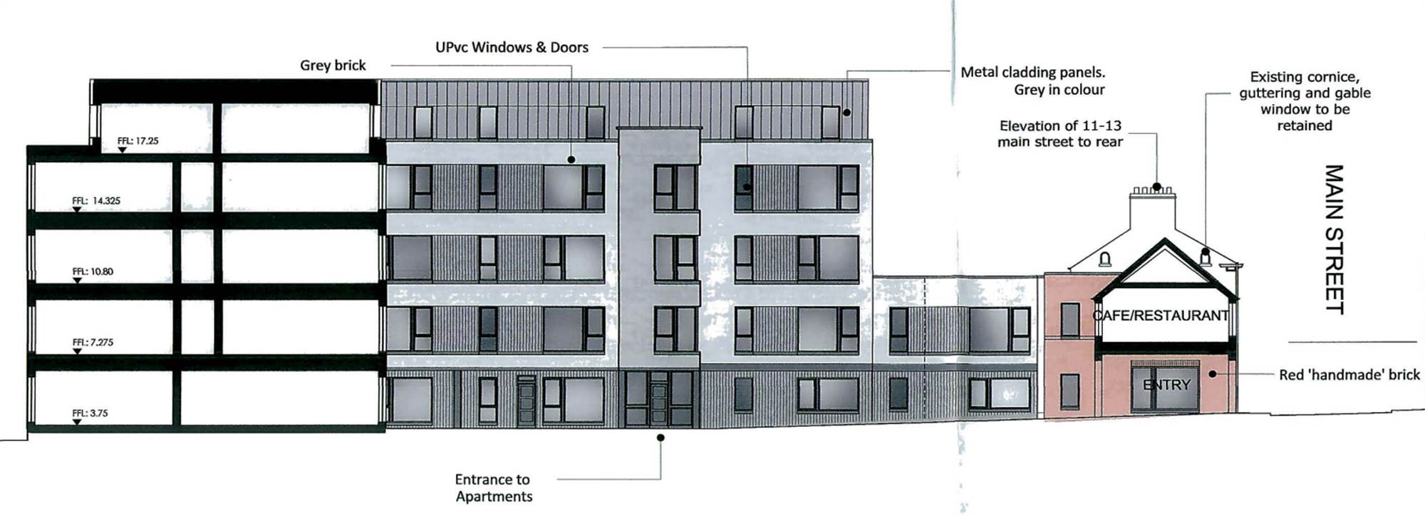 On 3rd September 2020 there was permission granted under application no: LA02/2019/0768/F for proposed mixed use development comprising 1 no. cafe unit fronting Main Street with internal courtyard/ walkway arrangement through to Point Street, 26 no. apartments with associated, cycle parking, bin stores and all associated site works including accommodation of existing electricity substation.