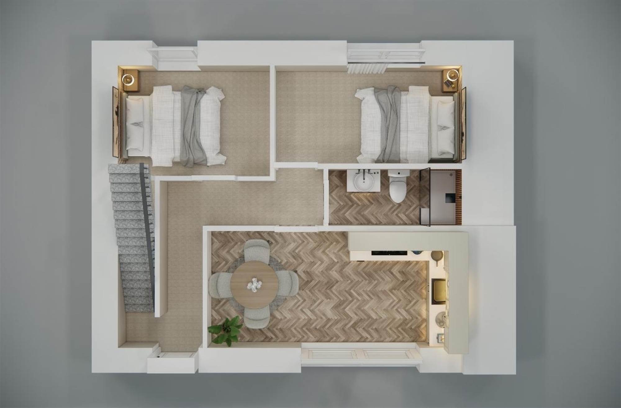 Herringbone wooden flooring in living rooms and carpets in bedrooms